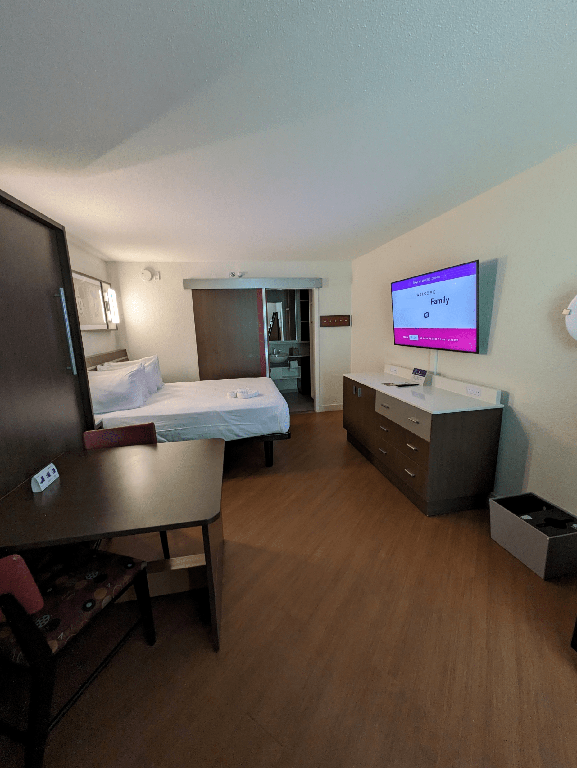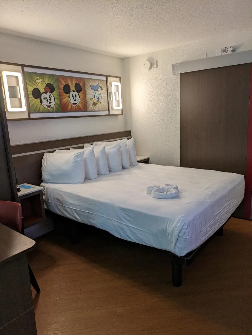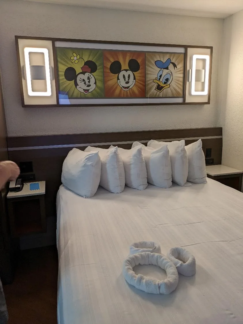 The Disney vibe continues when you get to your room. Like other resorts, when we entered the room, the TV was displaying a personalized welcome message to our family. But one thing we don’t always get at the other resorts were towels wrapped into the shape of Mickey ears on our bed. It was a nice greeting. Hung on the wall above the headboard was Disney art featuring Minnie, Mickey, and Donald. Their happy expressions brightened up the room almost as much as the lights incorporated into their picture frames.