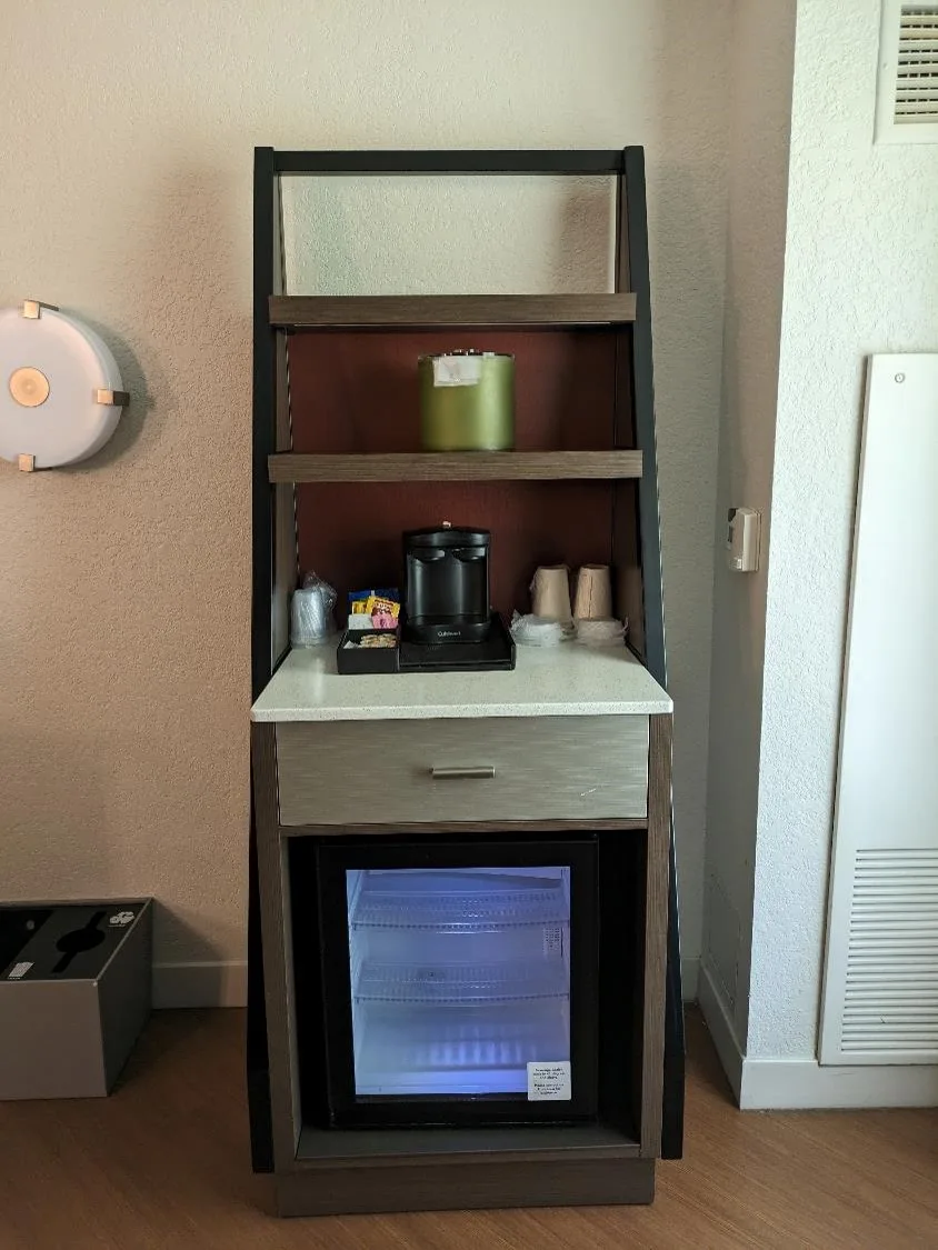 All of the rooms are motel-style rooms with exterior entries and stairwells and no inner hallways. If stairs aren’t your thing, each building has a set of elevators to bring you up to your floor. The standard rooms sleep up to four adults and have a queen bed and a queen-size Murphy bed that pulls down from the wall. When retracted the murphy bed functions as a table and when lowered it reveals more Disney art hidden above the headboard. The queen bed we slept on was comfortable enough, and our kids had no complaints about the murphy bed (Disney calls these “table beds”). Just don’t expect luxurious linens and plush duvets. The room also had a TV, dresser, safe, hairdryer, beverage cooler, and coffee maker. The coffee maker in our room was a single serve Cuisinart model that came with Joffrey’s coffee pods, not K-cup style capsules.