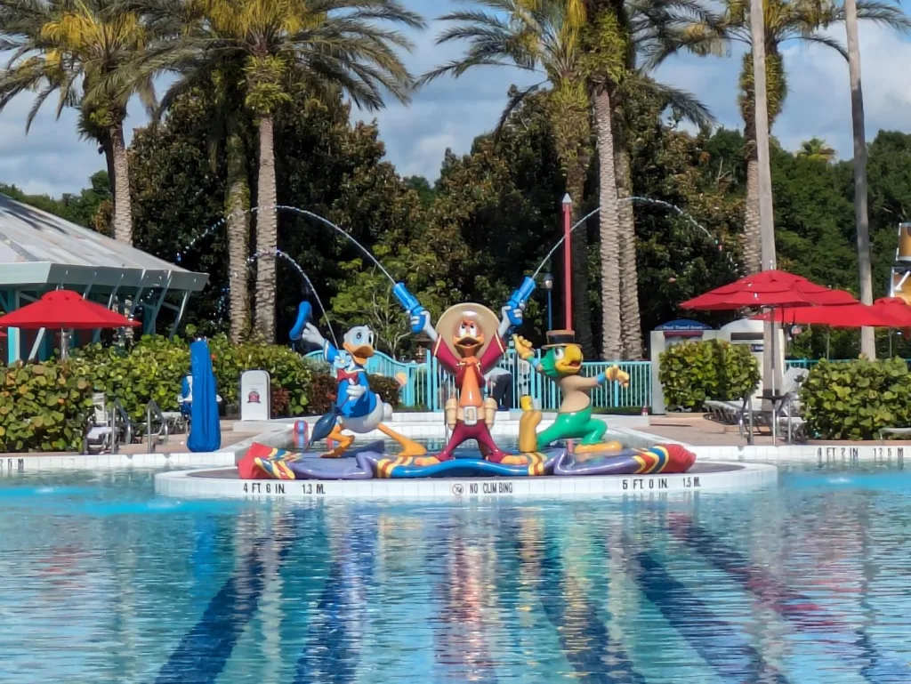 Even the pools have statues of Disney characters. The baseball-themed Grand Slam Pool at All Star Sports features Goofy on the pitcher’s mound firing a water cannon. All Stars Movies has the Fantasia Pool with Mickey Mouse as the Sorcerer’s Apprentice summoning water jets that spray swimmers. All Star Music has the guitar-shaped Calypso Pool with a statue of Donald Duck as part of the Three Caballeros.