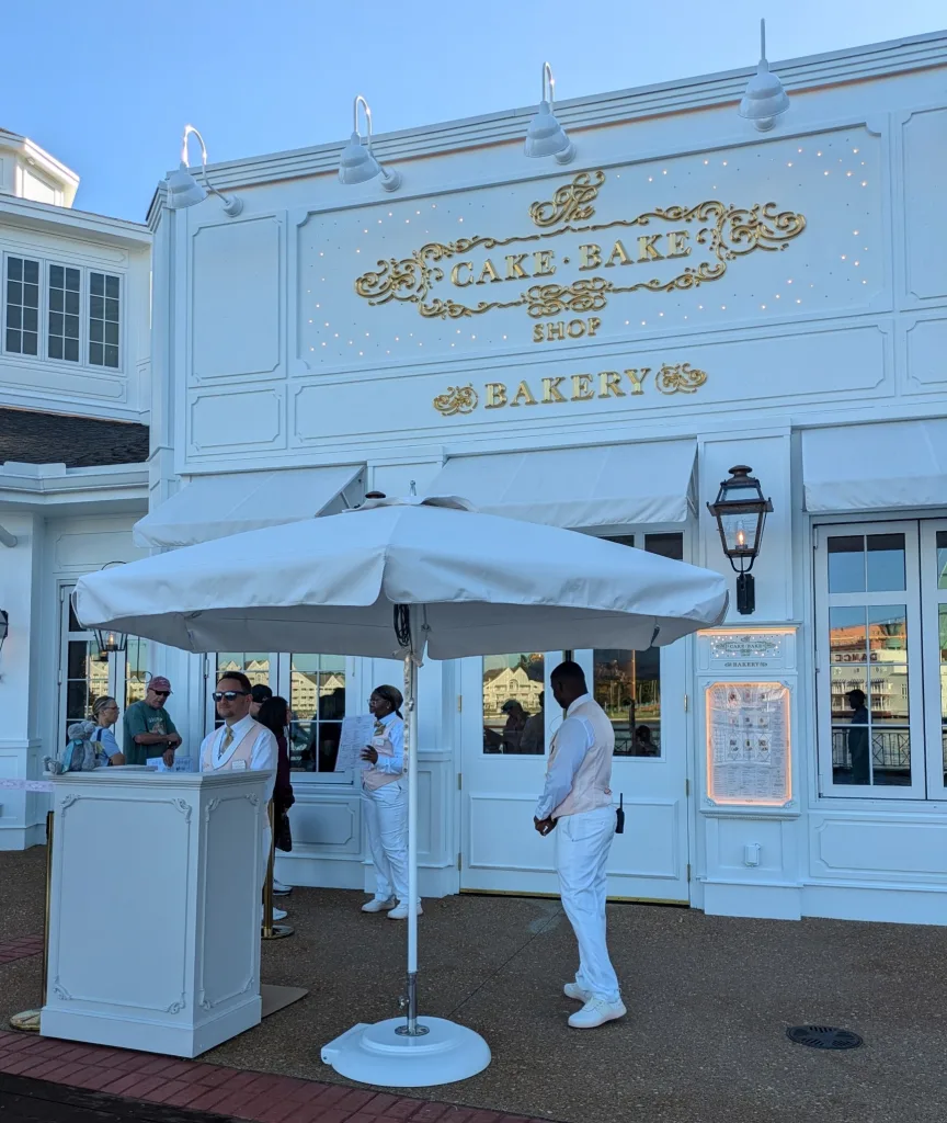 While on our journey, we got a hint that something was up when we saw people carrying these white bags with gold handles. Cake Bake bags? Looking ahead, we could see a few people in front of The Cake Bake Shop at the far end of Disney’s Boardwalk. Was it actually open or was it just another media preview? Maybe it was a soft opening? It was!