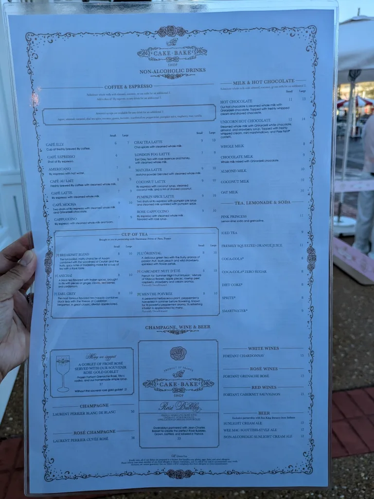 The cast member handed us menus and we got in line for the bakery. The menu was pretty extensive and featured cakes, pies, cookies, pastries, and an assortment of caffeinated and alcoholic beverages. The prices were not for the faint of heart.