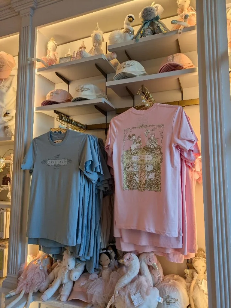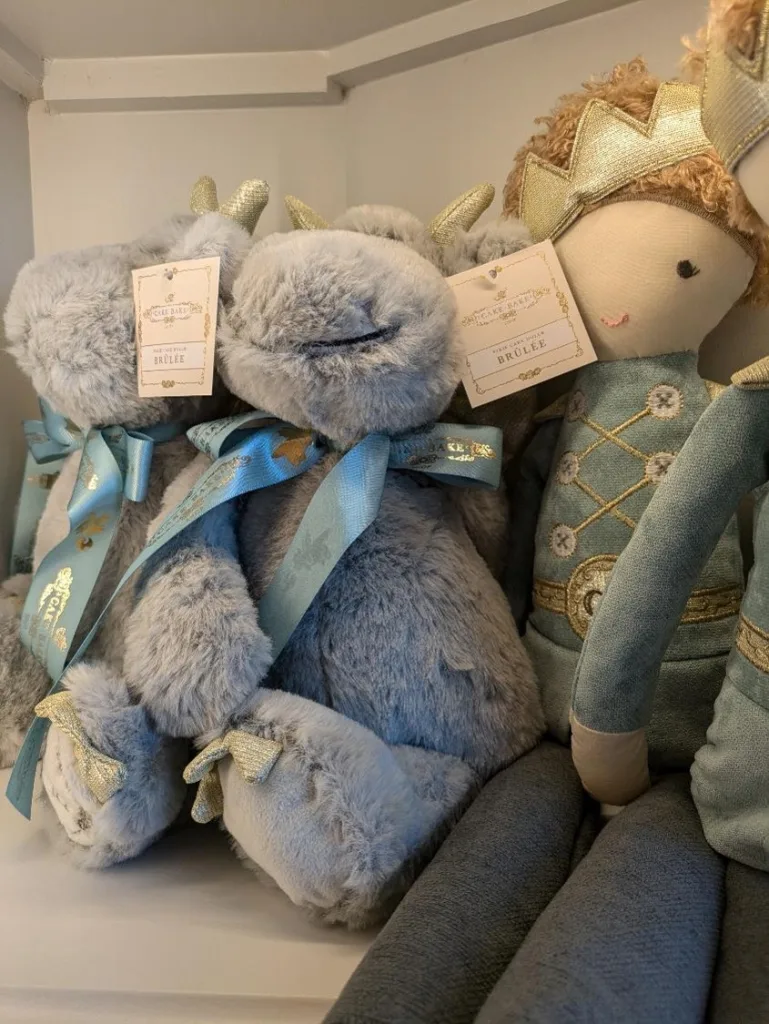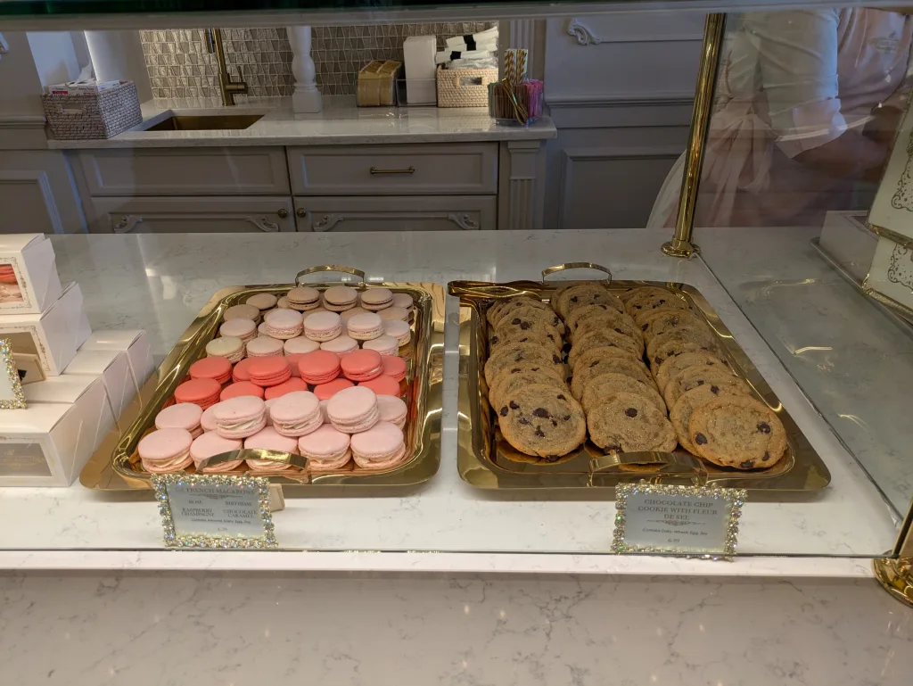 One of the cool things we learned while waiting at the register for our coffees was that Cake Bake has a special lore. We found out about the lore after a cast member noticed us admiring a stuffed dragon in the merch section. He told us the dragon was Cake Bake’s mascot named Brûlée. Legend has it that Brûlée wakes up early every morning, flies around the shop, and lights the chandeliers hanging from the ceiling. He also drops pixie dust everywhere, which can be seen on some of the baked goods, like the chocolate chip cookies. In fact, there’s a whole cast of characters, including a swan named Gwendolyn after the founder.