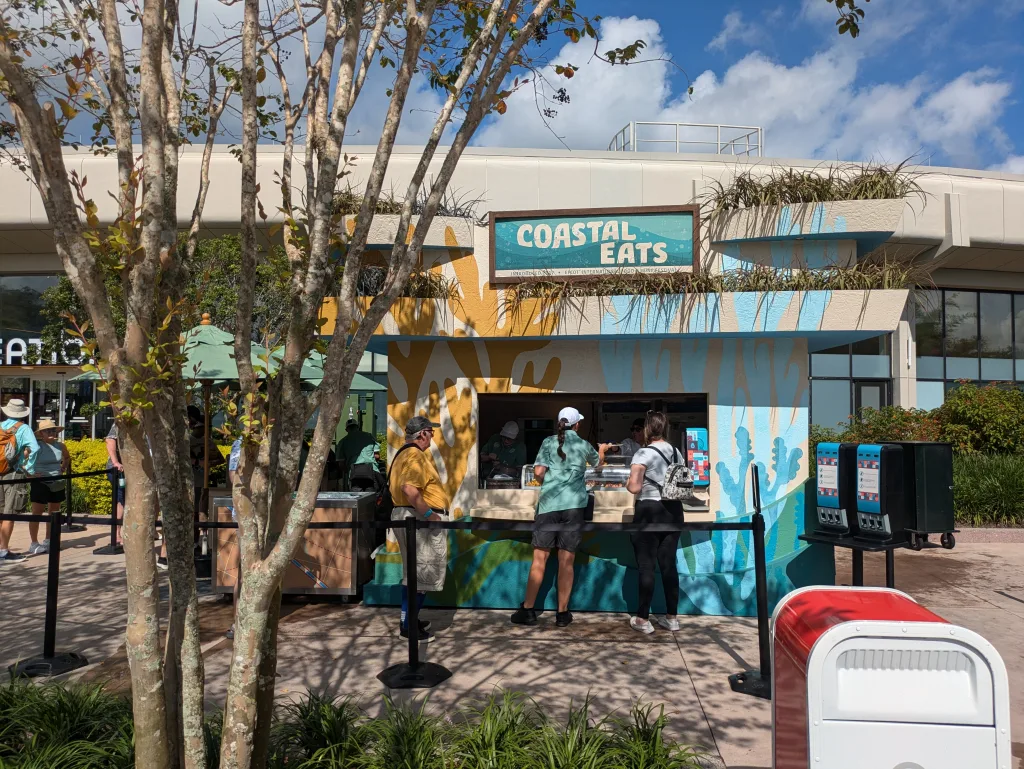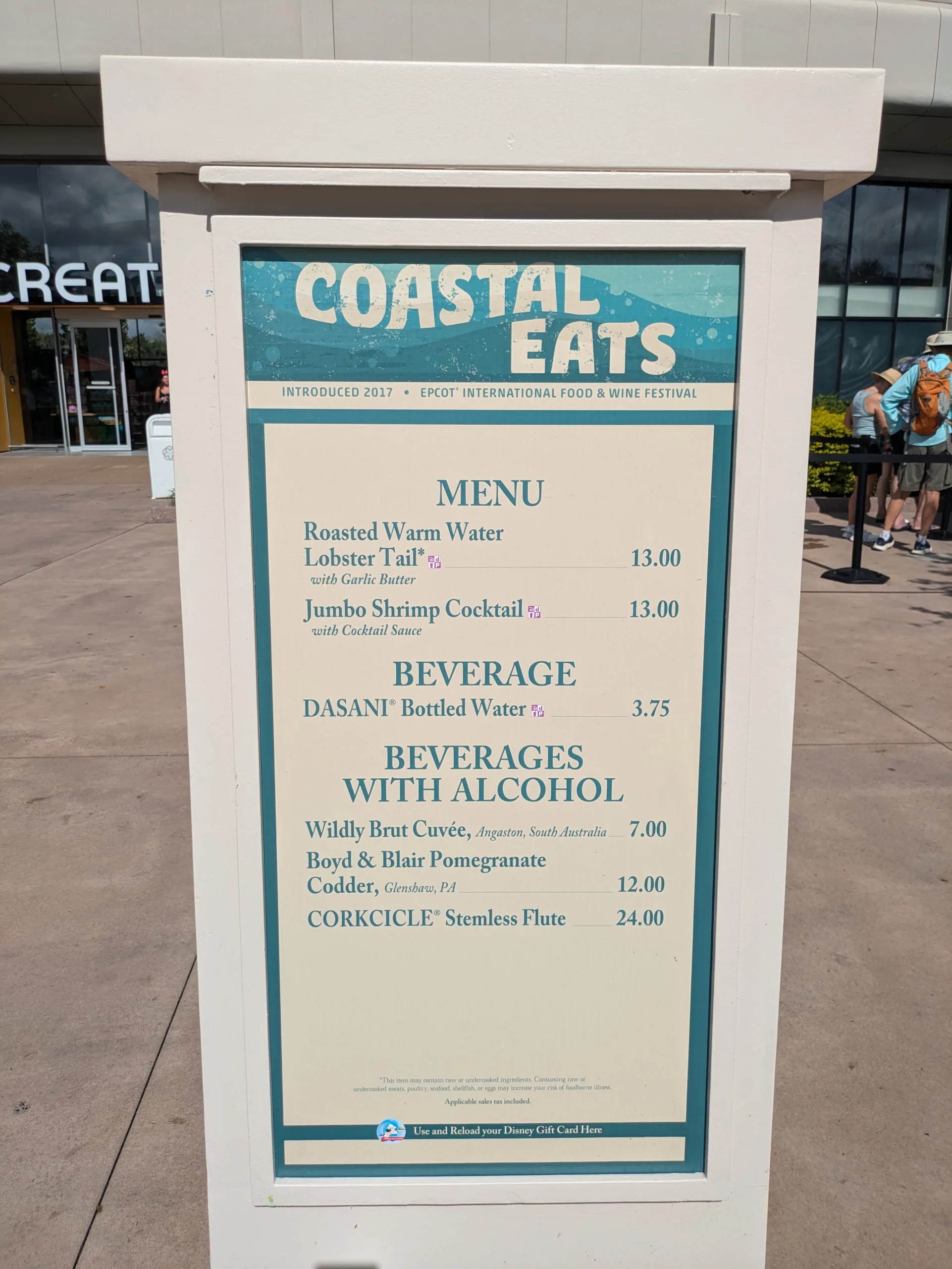 Today, we were tempted by the seafood offerings at Coast Eats. This festival quick service kiosk, located just outside of Creations Shop, has been a favorite of ours in the past. This year, they have two food options on the menu, and of course, we had to try both!