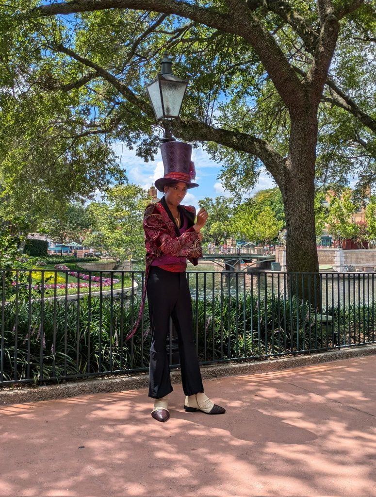 We entered EPCOT today using the International Gateway entrance near the skyliner. Often times, there is a character meet and greet just inside the park near the bridge between the UK and France pavilions. Normally, we see Minnie or Daisy there. Occasionally we see a princess, but today we saw Dr. Facilier and Tiana!