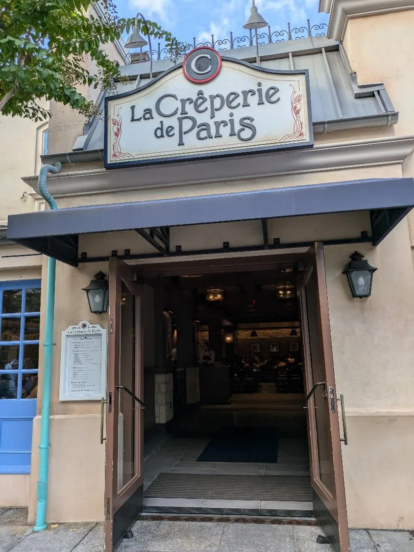 As for dining reservations, we were lucky enough to get a same day reservation on the My Disney Experience app. While the restaurant sometimes has a walk-up list available, we recommend getting reservations ahead of time if it’s a must-do for you. If reservations are unavailable, there is a quick service window at the restaurant called Crêpes À Emporter where you can order from a smaller selection of savory galettes and sweet crepes. You can also get cold refreshments like milkshakes and single scoop ice cream. The window opens at 9:00 AM, making it one of the few quick service eateries on the World Showcase that opens before 11:00 AM. At the time of writing, it shares the same hours as the restaurant, 9:00 AM to 11:00 PM.