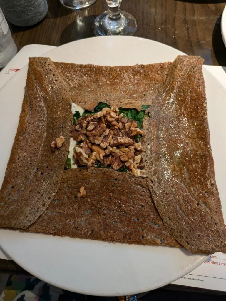For our entree we shared the Chèvre galette. This dish was delicious! 5 out 5 gold baguettes! Seriously so fantastic that we just kept telling each other how good it was after every bite. The galette itself was perfectly cooked with a toasty, nutty flavor from the buckwheat flour complementing the salty, creamy goat cheese filling. While the spinach and walnuts added a nice freshness, more nuttiness, and texture. It was so flavorful. I started taking smaller bites to make it last longer! This had us both exclaiming that we would be back just for this galette. Definitely try this one! It was our favorite of the day.