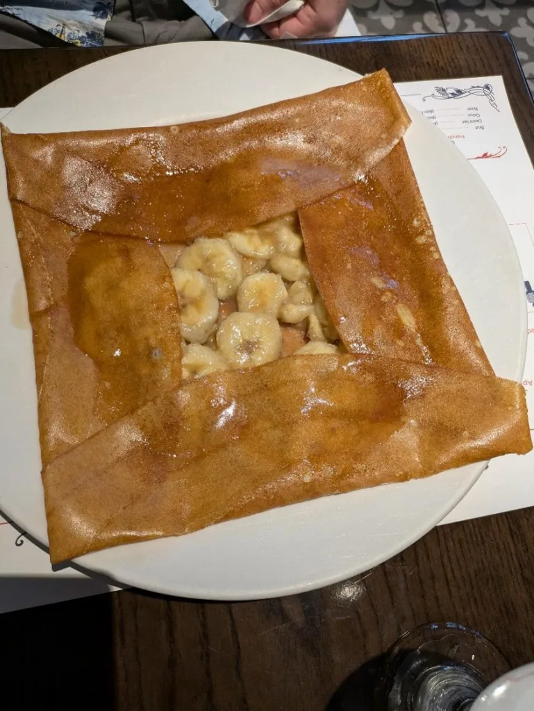 For our dessert crepe we both agreed on the Banana Caramel Beurre Salé. The star of the show was the salted butter caramel sauce that bathed the sweet, ripe banana slices. The sauce added a delicious richness to the dish, and was the standout flavor. The crepe encasing the filling was perfectly cooked and its delicate buttery texture enhanced the overall effect of the dessert, partnering well with the creaminess of the banana. There was plenty of filling to make every bite sweet. It was a perfect ending to the meal.
