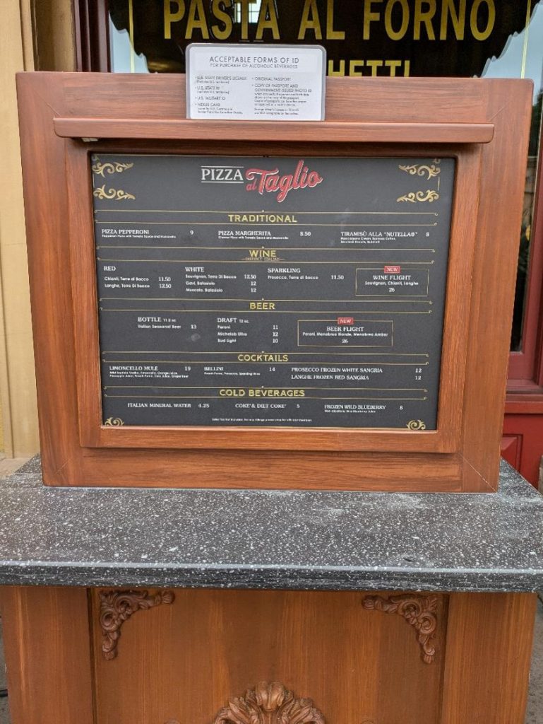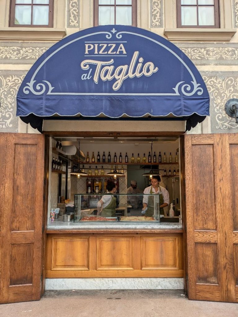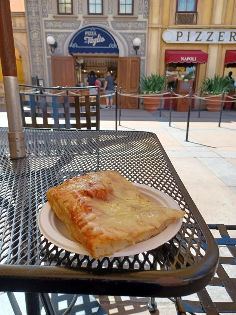 Plenty of sources will tell you Pizza al Taglio will be open when the parks are busy, like during spring break, holidays, festivals, or the summer season. Don’t count on it. We’ve seen it closed on crowded peak days and open on fairly low attendance mid-week days.