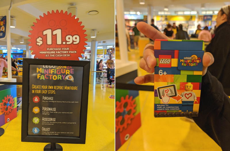 First, head to any register to buy a box for your Lego Minifigure . At the time of writing this article, the box costs $11.99 and it is your ticket into the area where you create your Minifigure .