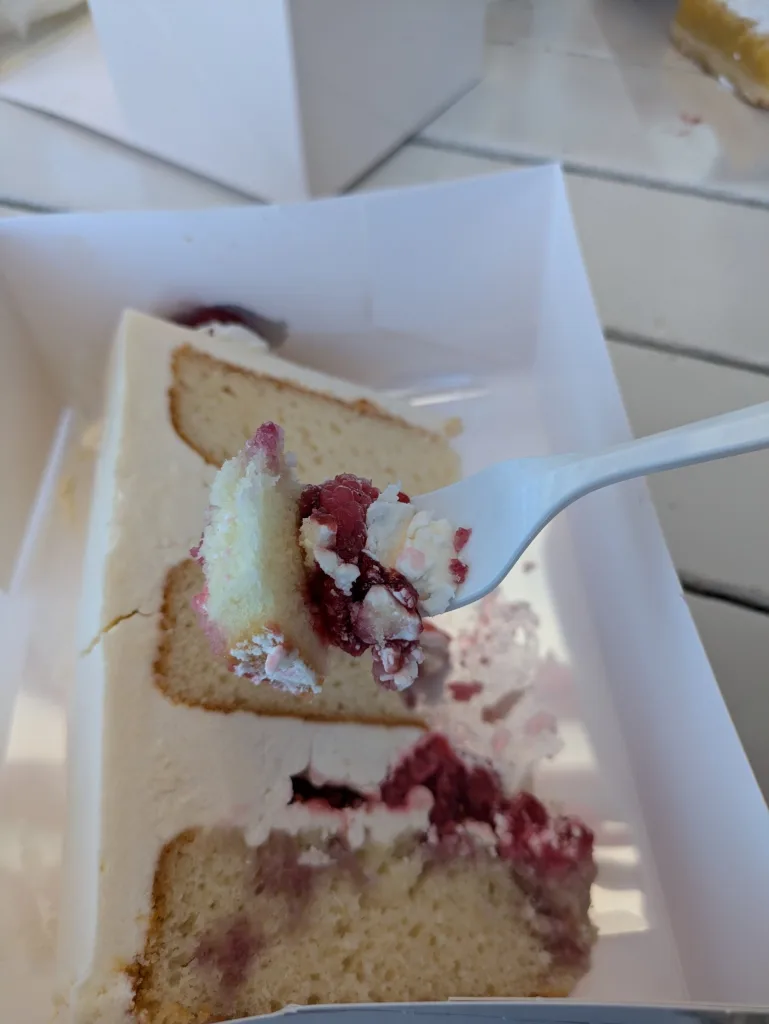 The Raspberry Champagne Cake slice ($22.99) was delicious. The menu describes it as “Three layers of fluffy vanilla cake brushed with a French champagne simple syrup, filled with our Raspberry Pixie Jam™ and fresh raspberries. Frosted with our champagne vanilla buttercream and topped with fresh raspberries.” We did not expect to like it as much as we did. The raspberries tasted ripe and sweet and paired so well with the vanilla cake and hints of champagne flavor from the syrup and frosting. That Swiss meringue buttercream was smooth, light and airy, and not too sweet. This was Mrs. Jotter’s ideal fairytale cake slice.