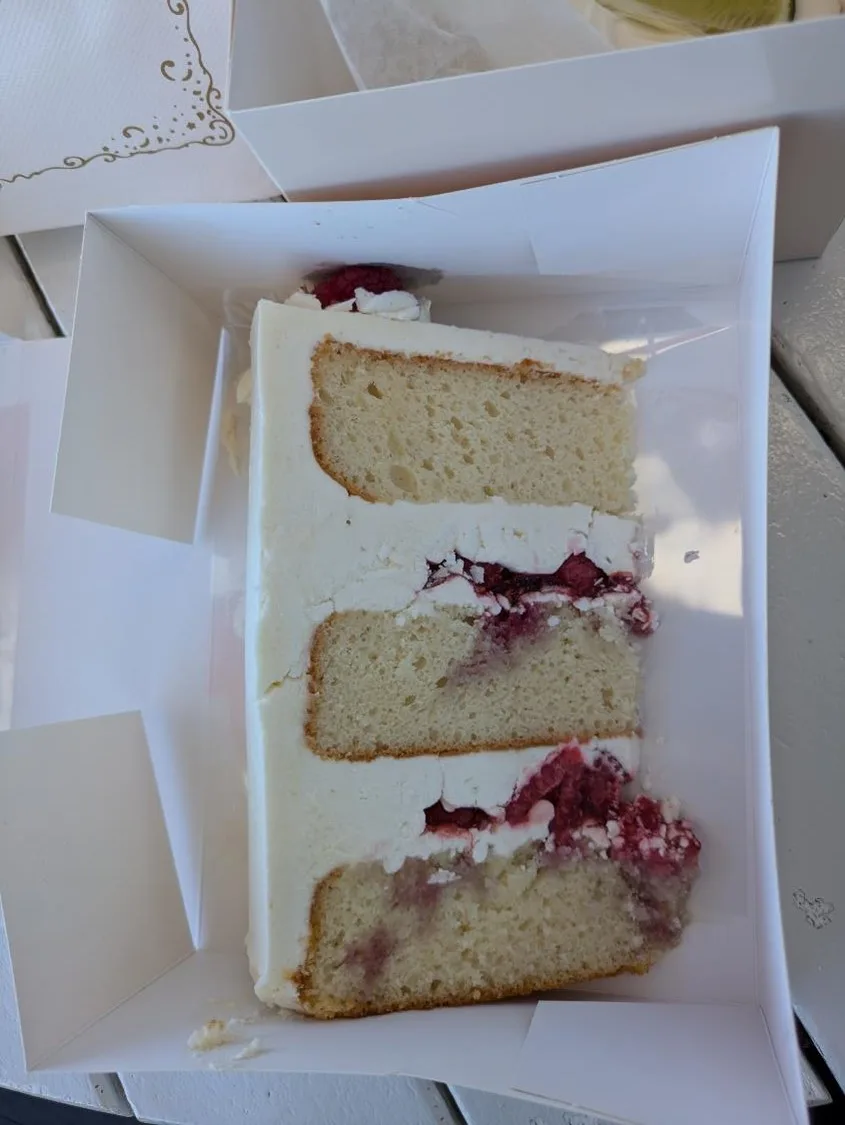 The Raspberry Champagne Cake slice ($22.99) was delicious. The menu describes it as “Three layers of fluffy vanilla cake brushed with a French champagne simple syrup, filled with our Raspberry Pixie Jam™ and fresh raspberries. Frosted with our champagne vanilla buttercream and topped with fresh raspberries.” We did not expect to like it as much as we did. The raspberries tasted ripe and sweet and paired so well with the vanilla cake and hints of champagne flavor from the syrup and frosting. That Swiss meringue buttercream was smooth, light and airy, and not too sweet. This was Mrs. Jotter’s ideal fairytale cake slice.