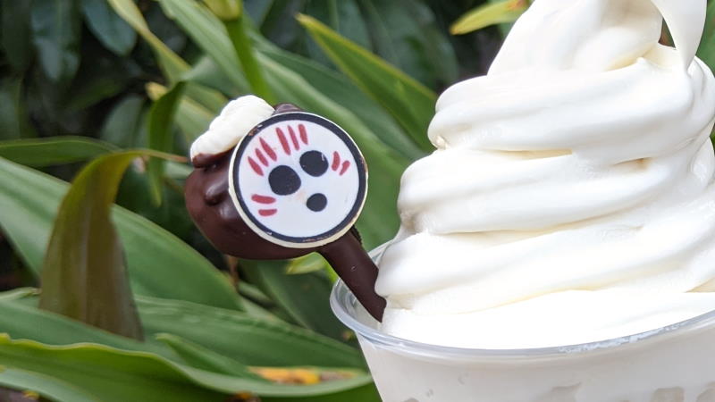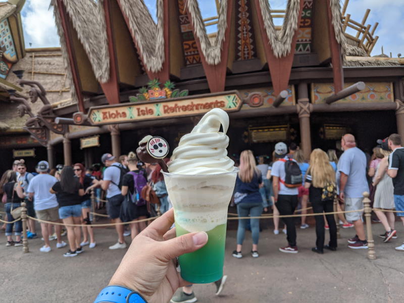 This adorable Moana-themed drink is now at Aloha Isle in Adventureland. Previously, it was only available during last season’s Mickey’s Very Merry Christmas Party, a separately-ticketed seasonal event. Now it’s available all day. This treat consists of a generous swirl of Coconut Dole Whip soft-serve floating on your own tiny sea of pineapple juice and (non-alcoholic) blue curacao syrup. It’s garnished with a Kakamora chocolate cake pop. The Coconut Dole Whip is rich and creamy with a pleasant coconut flavor, not too strong or artificial, a great pair with the pineapple juice. The Kakamora cake pop is like a bonus treat, chocolatey and dense, and a ton of flavor packed into a tiny bite. We’d definitely go back for this float. Be aware that it is not currently available on mobile order so you’ll have to wait in line to try it. It costs $6.99. No word on how long The Kakamora Float will be around so we suggest grabbing one while you can.